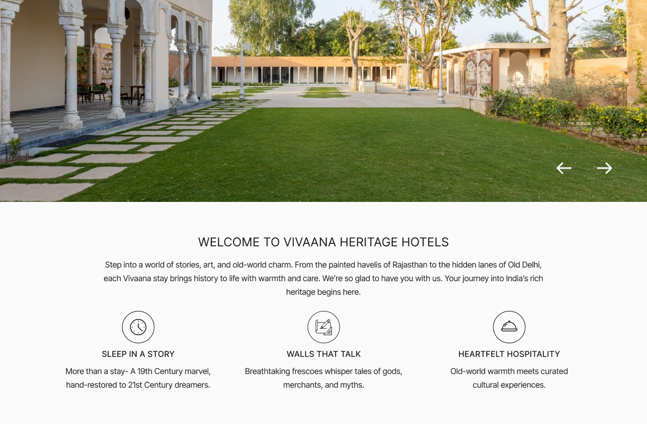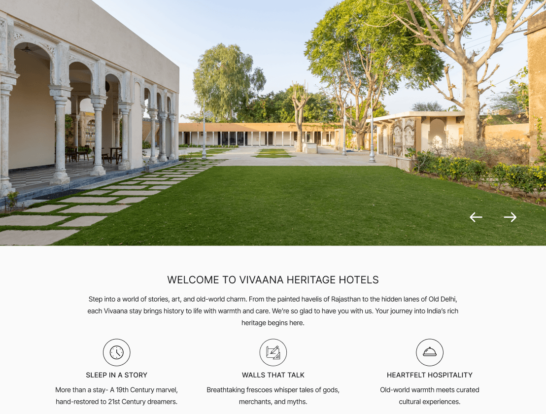 The goal was to design a website that captures this depth balancing storytelling with usability while positioning Vivaana as a premium, culturally rich stay. trused was simpatie the her de sexplore properties, enderstand the experience, and uns, stoking al hisions et orte sintent that highlights history, craftsmanship, and hospitality. The The result is a refined, story-driven website that elevates brand perception and creates a more engaging path to conversion.